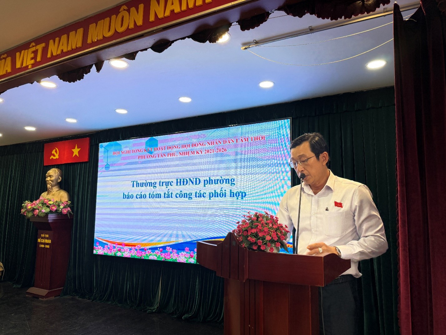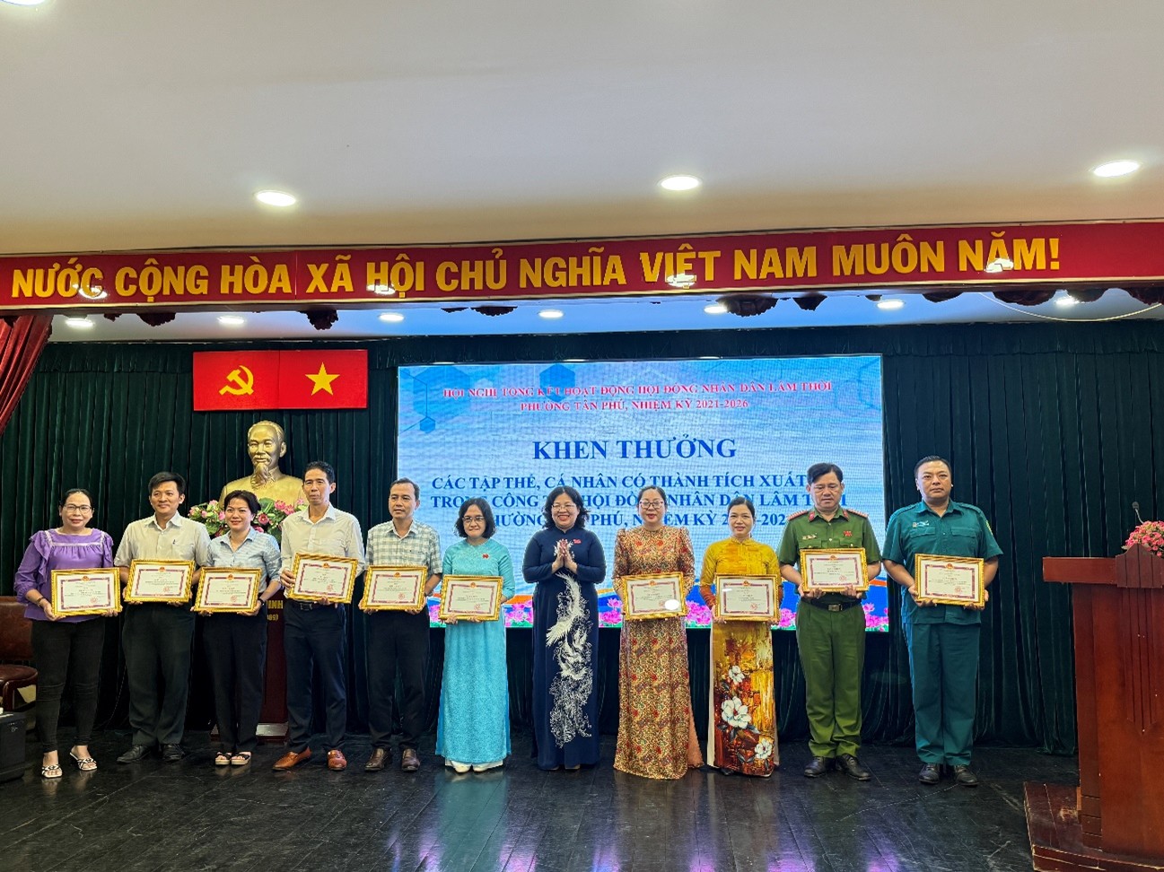 Nhằm đánh giá toàn diện, khách quan kết quả tổ chức, hoạt động và việc thực hiện các nghị quyết của HĐND phường trong nhiệm kỳ qua, nhất là các nghị quyết về phát triển kinh tế - xã hội, an ninh - quốc phòng, xây dựng đô thị, văn hóa, giáo dục, y tế, cải cách hành chính và đời sống nhân dân, qua đó làm cơ sở định hướng, xây dựng nhiệm vụ trọng tâm cho nhiệm kỳ 2026-2031; ngày 31/12/2025, HĐND lâm thời phường Tân Phú nhiệm kỳ 2021-2026 đã long trọng tổ chức Hội nghị tổng kết hoạt động Hội đồng nhân dân lâm thời phường, nhiệm kỳ 2021-2026.