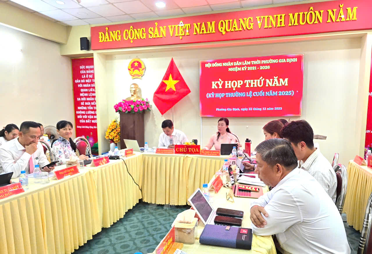 Chiều ngày 22/12/2025, Hội đồng nhân dân lâm thời Phường Gia Định, nhiệm kỳ 2021 – 2026 long trọng tổ chức Kỳ họp thứ Năm (Kỳ họp thường lệ giữa năm 2025) để tiến hành quyết nghị các vấn đề quan trọng tại địa phương về kết quả thực hiện nhiệm vụ kinh tế - xã hội năm 2025 và phương hướng thực hiện nhiệm vụ kinh tế - xã hội năm 2026; Báo cáo ước thực hiện thu, chi ngân sách năm 2025, dự toán thu, chi ngân sách và phương án phân bổ ngân sách phường Gia Định năm 2026; Báo cáo kết quả hoạt động giám sát của Thường trực Hội đồng nhân dân phường...Đến tham dự có sự hiện diện của Bà Triệu Lệ Khánh – Bí thư Đảng ủy – Chủ tịch HĐND phường; Bà Nguyễn Thu Hiền – Phó Bí thư Đảng ủy – Chủ tịch UBND phường; Ông Tạ Thanh Khiêm – UVTV – Phó Chủ tịch HĐND phường; Bà Trần Thị Thu Trang – UVTV – Chủ tịch UB. MTTQ VN phường cùng các ông/bà đại diện lãnh đạo các phòng ban chuyên môn trực thuộc UBND phường, lãnh đạo các tổ chức chính trị - xã hội; đại diện đơn vị lực lượng vũ trang phường. Đặc biệt là sự hiện diện của 10 vị Đại biểu Hội đồng nhân dân lâm thời Phường Gia Định, nhiệm kỳ 2021 – 2026.