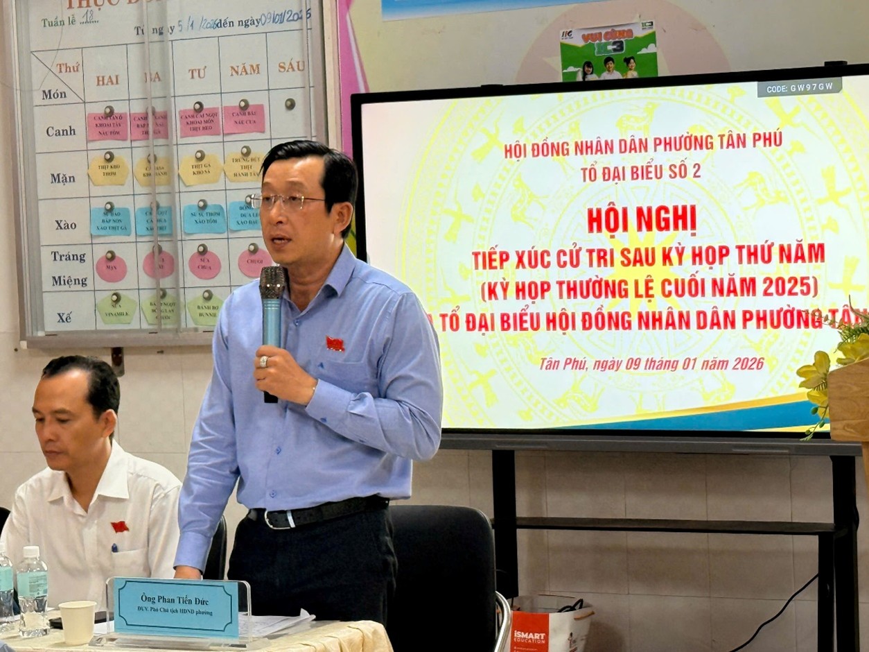 Từ ngày 07/01/2026 đến ngày 09/01/2026, Hội đồng nhân dân phường phối hợp Mặt trận Tổ quốc Việt Nam phường tổ chức Hội nghị tiếp xúc cử tri sau kỳ họp thường lệ cuối năm 2025, kỳ họp thứ Năm Hội đồng nhân dân phường, nhiệm kỳ 2021 - 2026.