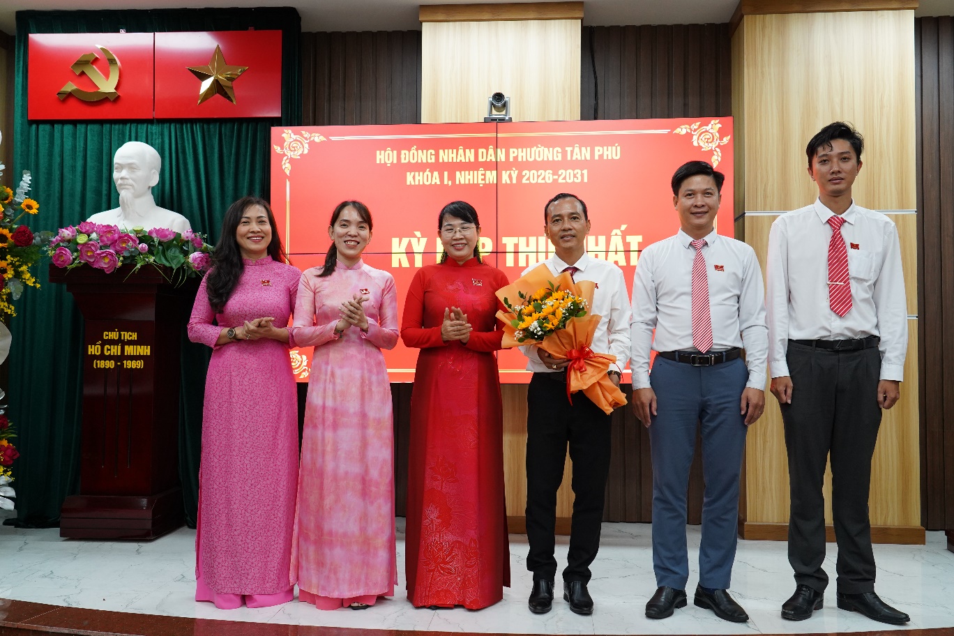 Đ/c Lê Thị Kim Hồng - Bí thư Đảng ủy, Chủ tịch HĐND phường tặng hoa chúc mừng Thường trực UBND phường và các Ủy viên UBND phường nhiệm kỳ 2026 - 2031