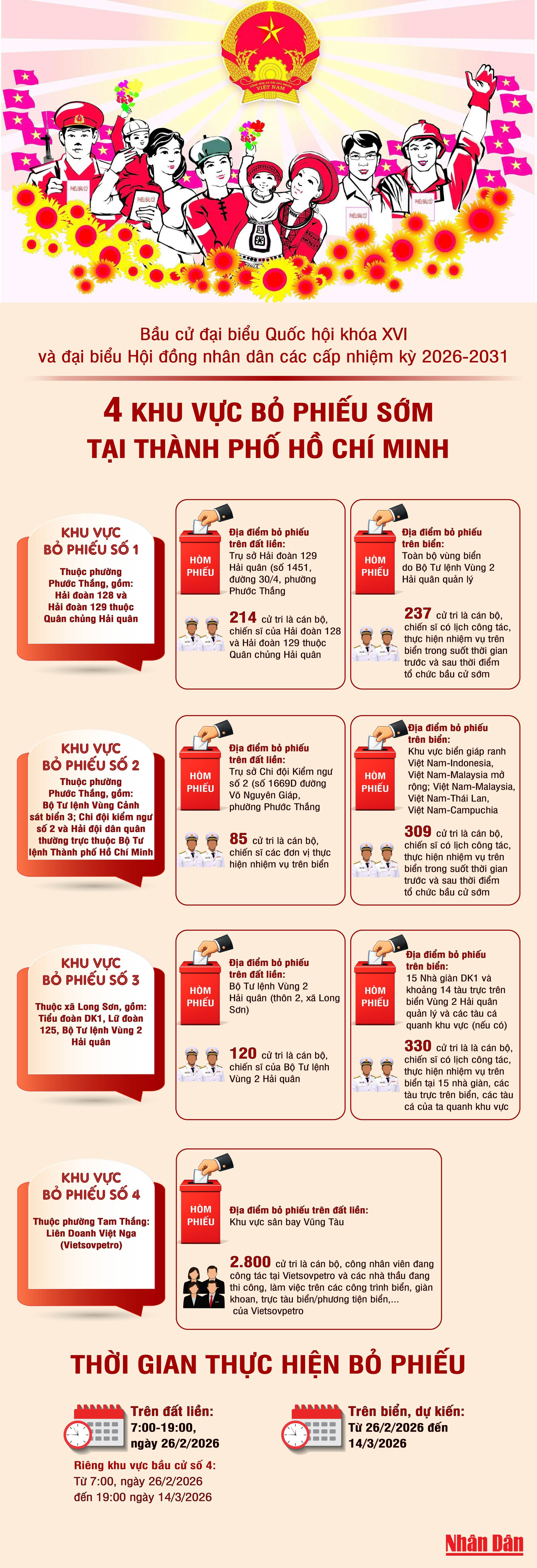 Theo Ủy ban Bầu cử đại biểu Quốc hội khóa XVI và đại biểu Hội đồng nhân dân Thành phố Hồ Chí Minh nhiệm kỳ 2026-2031, 4 khu vực bỏ phiếu sớm tại Thành phố Hồ Chí Minh thuộc phường Phước Thắng, phường Tam Thắng và xã Long Sơn.