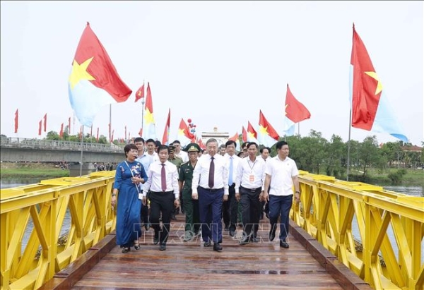 Tổng Bí thư, Chủ tịch nước Tô Lâm và các đại biểu trên di tích cầu Hiền Lương. Ảnh: TTXVN